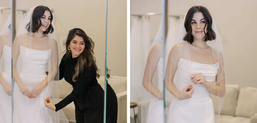 While there are many options, picking a veil doesn’t have to feel overwhelming. Once you know the basics, it’s such an exciting part of completing your bridal look. Different lengths can totally change your vibe: fingertip and waltz veils add soft movement and work great with fitted dresses, while cathedral length veils bring all the drama for those big, dreamy entrances. You can also decide whether you want to keep things simple with a plain veil or add a little sparkle or lace if your dress is more minimal. Think of it like choosing the finishing touch that either balances or boosts your gown.